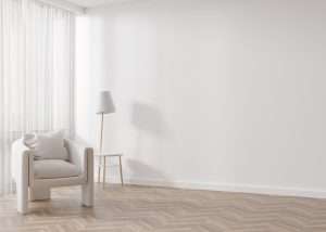 Room with parquet floor, white wall and empty space. Armchair, table. Mock up interior. Free, copy space for your furniture, picture, decoration and other objects. 3D rendering.
